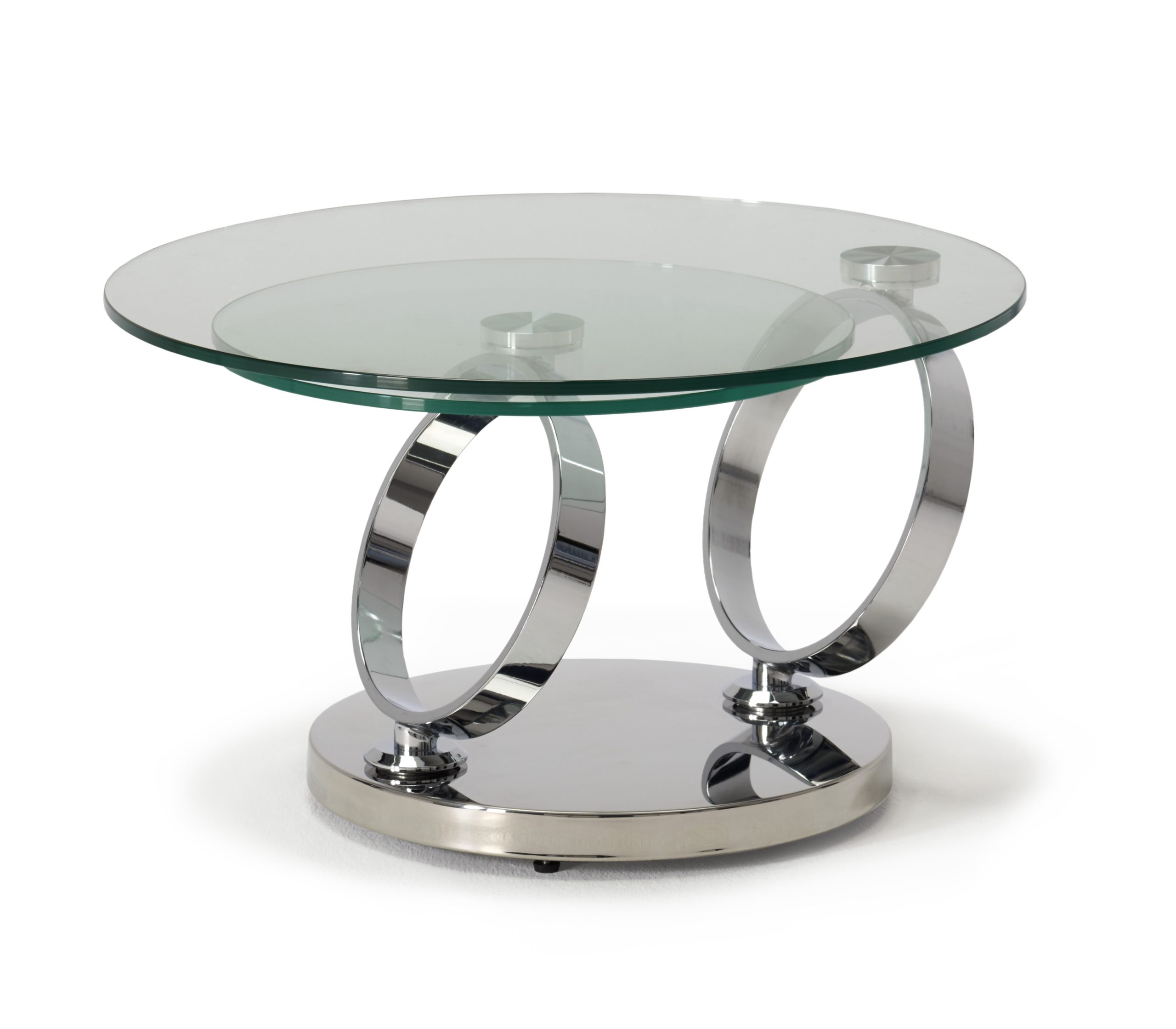 Rings Swivel Coffee Table. Polished Stainless Steel frame with clear toughened glass top.